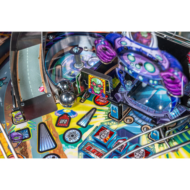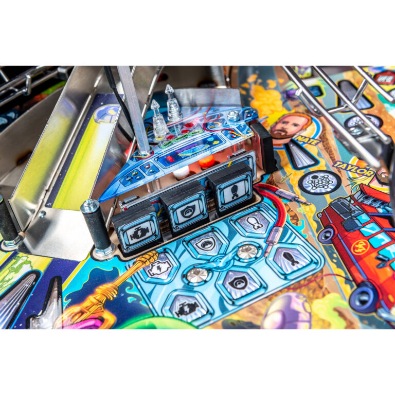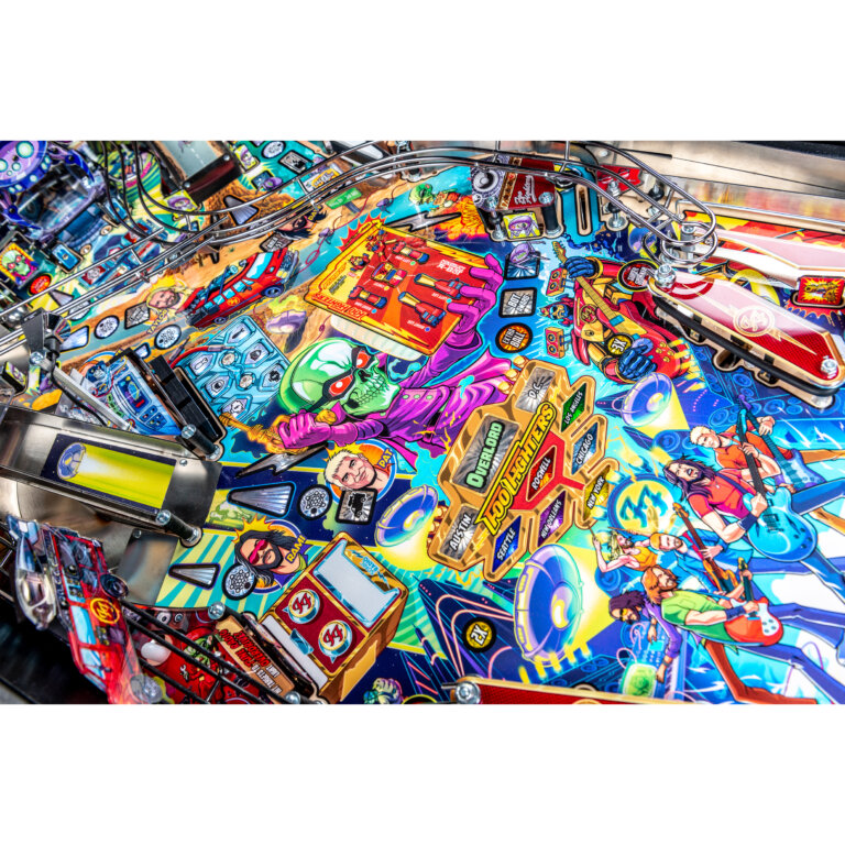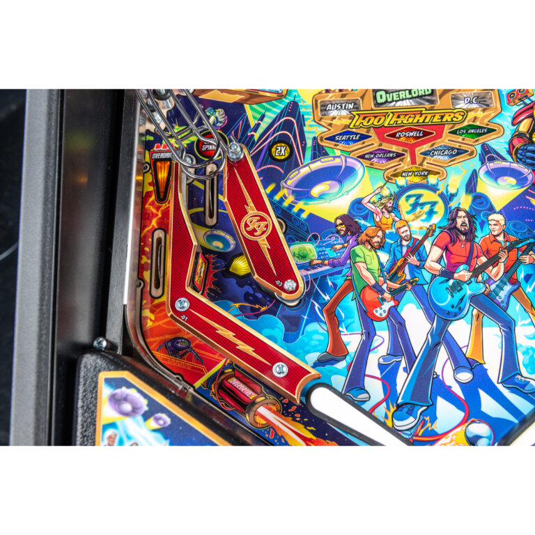 More than two years in the making and with creative input from the band’s own Dave Grohl, Nate Mendel, Pat Smear, Chris Shiflett, Rami Jaffee, and the late, great Taylor Hawkins, Stern’s Foo Fighters is a top-shelf pinball machine—and so much more. An entire new universe has been developed with jaw-dropping hand-drawn artwork and custom animations including “Foo Fighters Saturday Morning Action Time!”—a fictional TV series chronicling the band’s quest to save rock and roll… AND THE WORLD! Join Foo Fighters on this rescue mission to thwart the evil, mysterious alien Overlord and his army of bots. Search the Area 51 upper playfield (Premium and LE models) to break into and unleash pinball chaos. Jump in the van for a righteous tour of duty to save humanity from extinction and let rock rule!