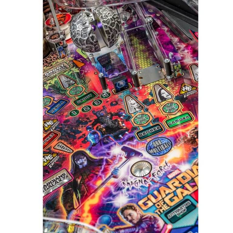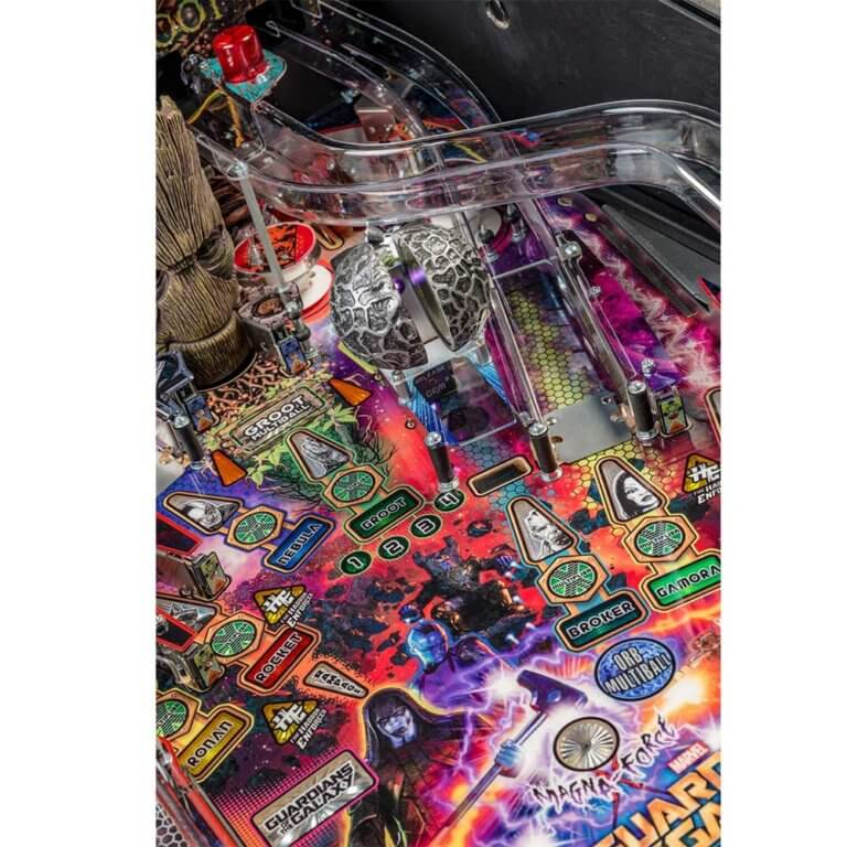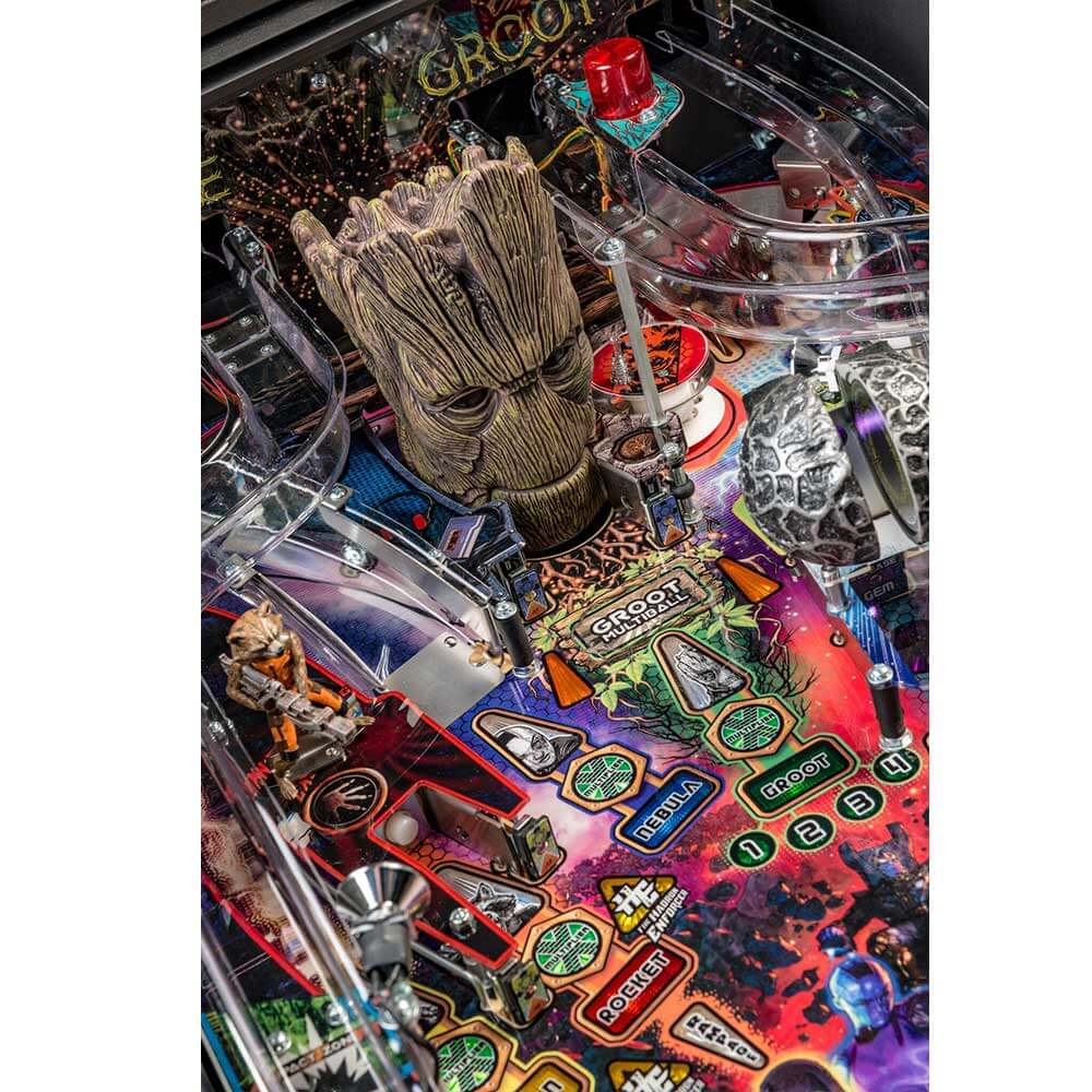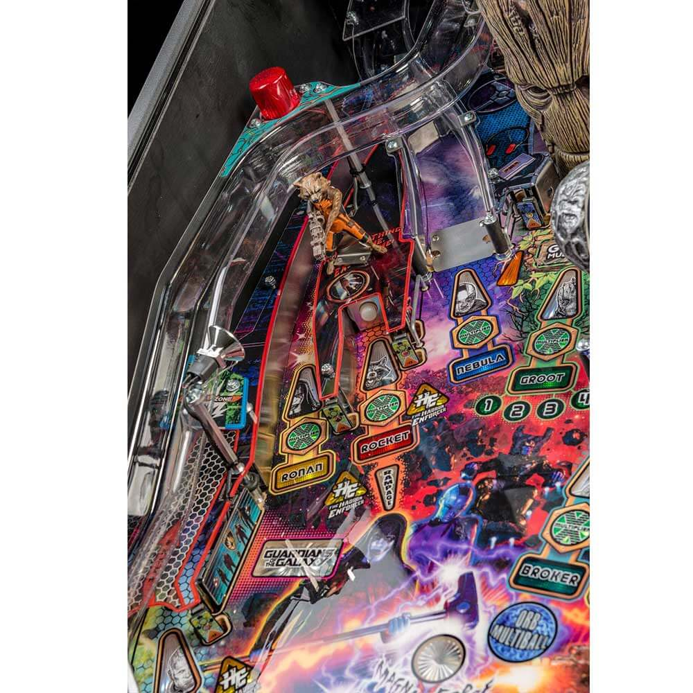Stern’s Guardians of the Galaxy Pro model is packed with features that provide an irresistible gameplay experience. Each game features a sculpted and interactive ball-eating Groot. In addition, a custom sculpted Rocket figure will keep players on their toes as it blasts the ball back at rocket speed. Color-changing inserts highlight the mysterious and interactive Orb, which opens to reveal the powerful Infinity Stone.