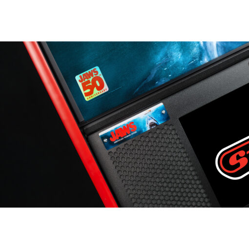 To mark this golden anniversary, the Stern team has crafted an epic version of its popular Jaws pinball machine. The JAWS 50th Anniversary Premium Edition features a reimagined playfield with glitter-enhanced artwork and brass powder-coated wireform ramps. This collector’s item also boasts a distinctive 50th Anniversary hologram sticker along with a unique translite and cabinet decals. The pinball machine is outfitted with a bold “Blood Red” armor kit, including matching legs, hinges, front molding and side armor with standard premium shape.