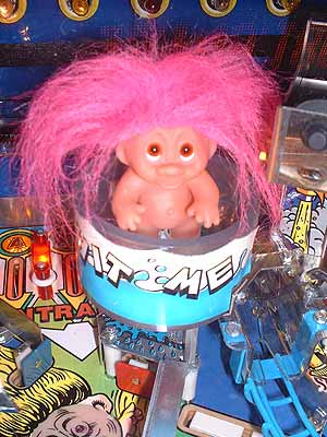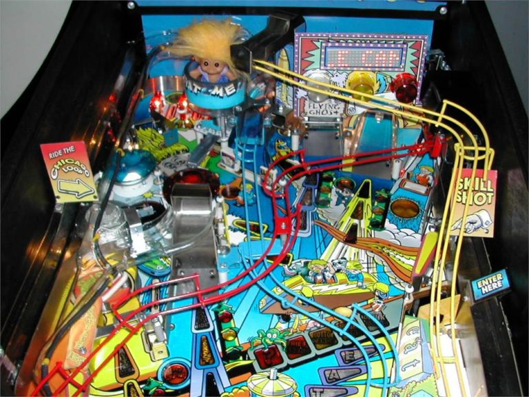 To best understand how the ROLLERCOASTER TYCOON® pinball machine works, picture the ball on a ramp as you would a rider on a roller coaster. The playfield has 4 roller coasters, including The Flying Ghost, The Flying Turns, an inverted ramp coaster called The Chicago Loop, and the The Rocket, a coaster that blasts the ball almost to the playfield glass before sending it on a wild ride around the playfield. Other rides and features include the Scrambled Eggs spinning ride, the pop bumper Bumper Cars, the Handyman drop target, the Maintenance Men stand-up target, the hysterical Dunk the Dummy side attraction, and an information kiosk that gives out random awards.