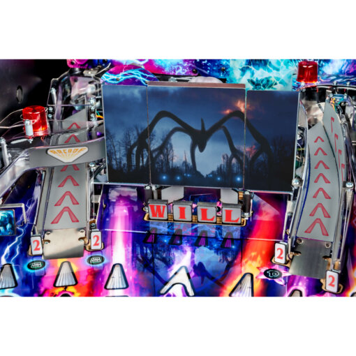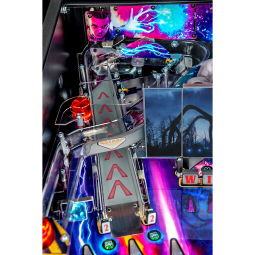The Premium model features a first ever video projector that displays images and animations directly on the playfield, creating dramatic interactions with gameplay action. The center of the playfield features a unique ramp that doubles as a screen and leads the player into a direct battle with the Demogorgon. These models also feature a new Eleven themed “telekinetic” magnetic ball lock.