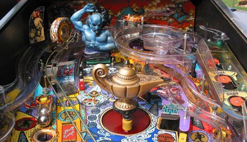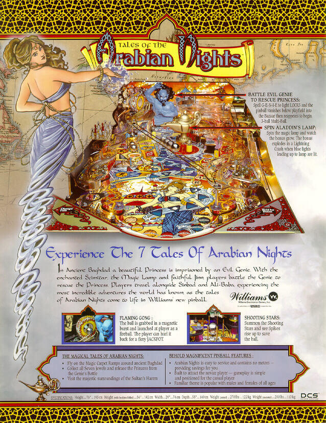Tales of the Arabian Nights is a 1996 pinball machine produced by Williams. The game is based on the stories of One Thousand and One Nights and features a blue jinn. The marketing slogan is “Your Wish is Granted”.