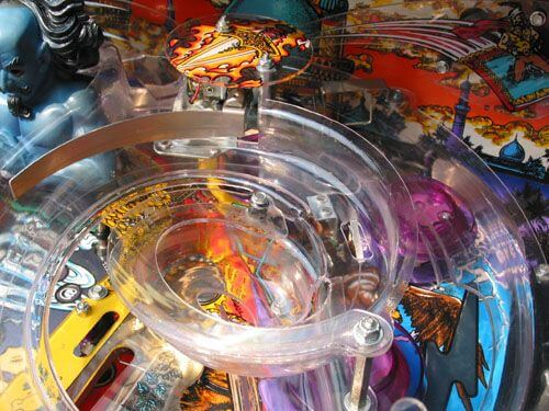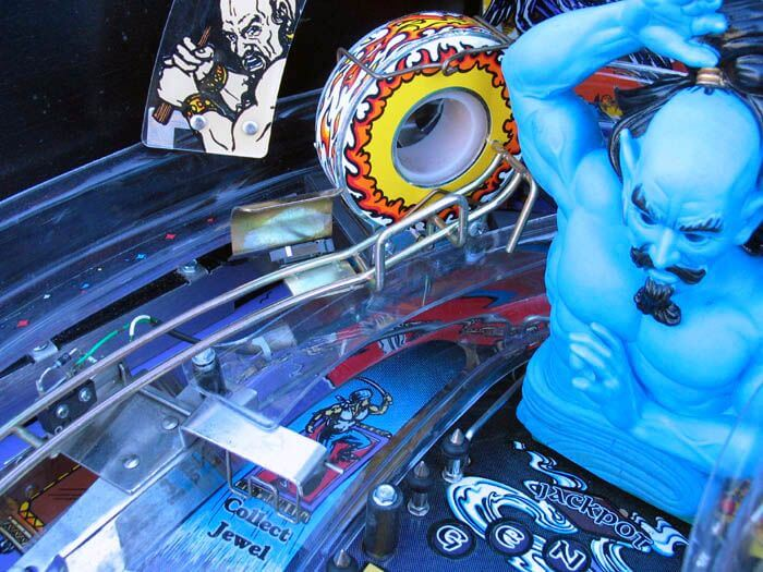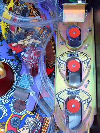 Flippers (2), Pop bumpers (3), Slingshots (2), Spinning posts (2), Captive balls (2), Kick-out hole (1), Electromagnet (1), 2- 3- and 4-ball multiball, Shooter lane skill shot. The top of each flipper inlane has a circle of metal “spikes” that can rise up from within the playfield to temporarily encircle the ball and stop it from exiting the outlane. Lamp on top of spinning posts. Genie bash toy.