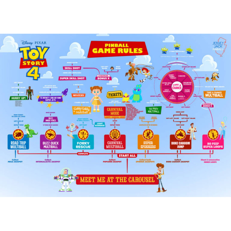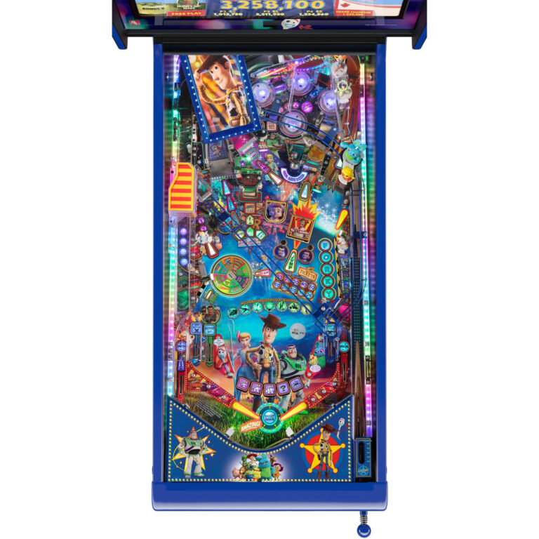 Players can send the silver-ball flying off the Duke Caboom jump ramp — just don’t let the Bensons block your shot! Blast into the jet bumpers to collect a super jackpot in Buzz Multiball, and aim for the stand-up targets to light Rescue Forky. Hurry up and bash Gabby Gabby into a pinball frenzy on the way to scoring Grand Champion. Take a chance on the spinning wheel to earn different awards like Extra Ball, Tiki Party, Super Loops and more! Start interactive carnival games like Star Adventurer, Dragon Zone, Squirrel Derby, and Flipball on the 10-inch playfield frame display.